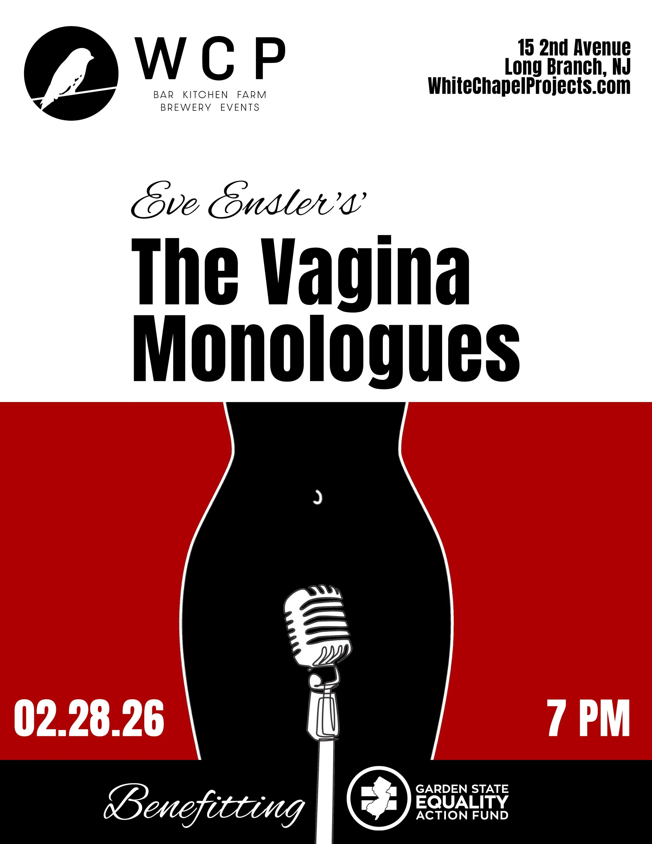 Join us at Whitechapel Projects on February 28th for a powerful live reading of Eve Ensler’s iconic work, performed by a cast of inspiring local women. Your ticket guarantees a seat for the performance—arrive early to enjoy dinner and a drink before the show. Ticket proceeds will benefit Garden State Equality, supporting our community.